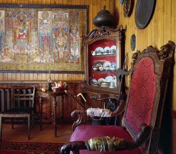 Обычно все комнаты в дачах были проходными, а часть комнат вообще не имели мебели. Зато кругом стояли станки, лежали инструменты, а деревянные дома заляпаны глиной, гипсом и красками. Вот и в гостиной Сосланбека Тавасиева, чей дом мы сейчас рассматриваем, ковры до сих пор закрывают пятна, оставшиеся от деятельности учеников скульптора.