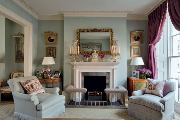 Мебель подбирается традиционной, но можно немного пофантазировать с обивкой: вместо материала в мелкий цветочек, Джей использовала серо-лиловый атлас. Узоры же добавляют немного контраста, что совсем не мешает определять стиль интерьера, как английский.