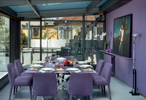 В квартире есть и дизайнерская мебель от известных итальянских мастеров, которая неплохо сочетается с лиловыми, зелеными цветами, которые приобретают разные оттенки в зависимости от освещения комнат.