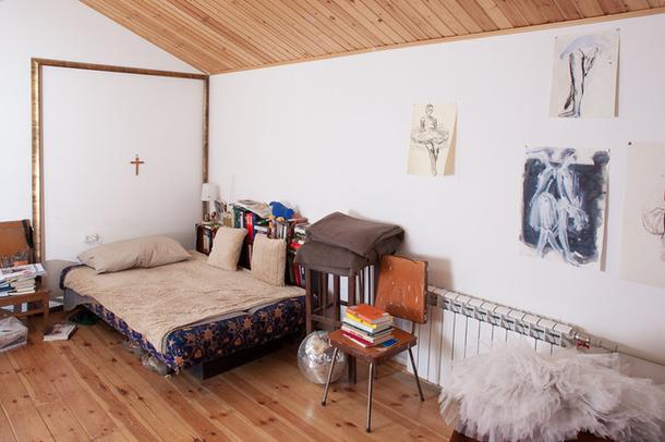 Рядом с кроватью висят гигантские кисти и балетная пачка. Их подарили друзья в память о том, что балерина и театр вдохновляют художника писать великолепные образы хрупких женщин. Если нет сил разводить краски, то можно и книги почитать: полка с последними находится здесь же.