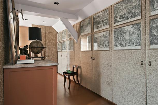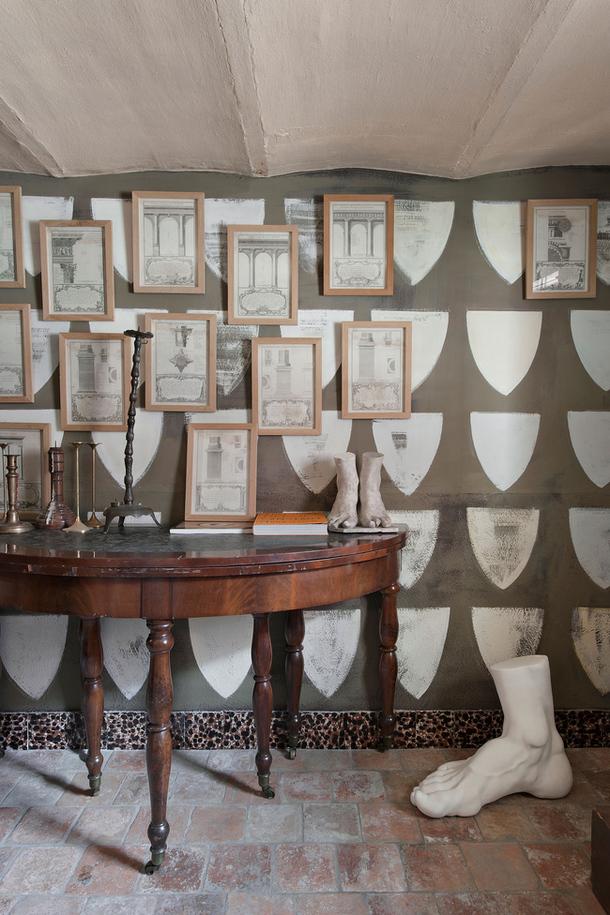 Стены одной из комнат сплошь в карандашных рисунках. Это довольно удачное решение для того, чтобы передать желание хозяина быть всегда со своими любимым работами: Доминик любит посидеть на природе с углем или графитом в руке.