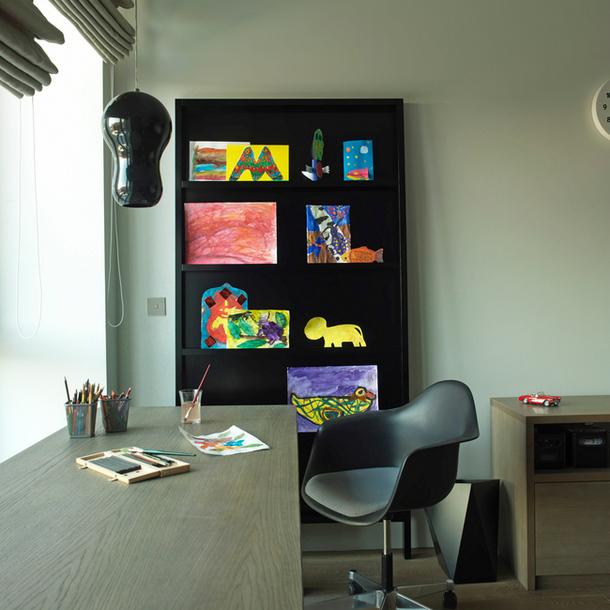 Для игровой предусмотрен специальный уголок, куда попадают дневные лучи света. При необходимости комнату можно затенить римскими шторами.