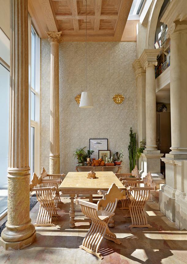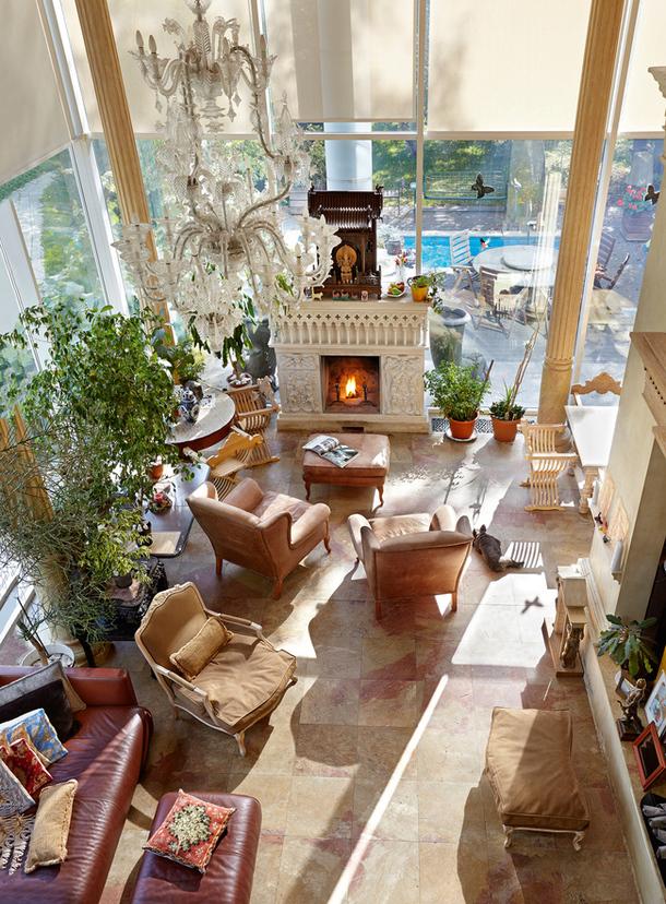 По задумкам Гликмана, его вилла – это один дом в другом. Тут можно наблюдать двусветное пространство, высокие колонны, различные элементы классики. Но современное оснащение дома всеми необходимыми компонентами: телевидением, мебелью, освещением – придает дому современный уют.