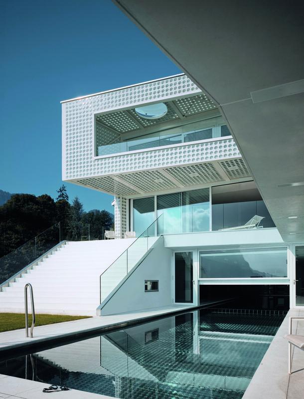 В самом строении несколько фасадов. Одним из них фасадом дом как бы смотрит на безграничное озеро и горизонт, перечеркнутый острыми вершинами Риги и Бургеншток. Можно выйти и на лоджию, чтобы вдохнуть чистый воздух, который проникает через стеклянные окна в виде кругов.