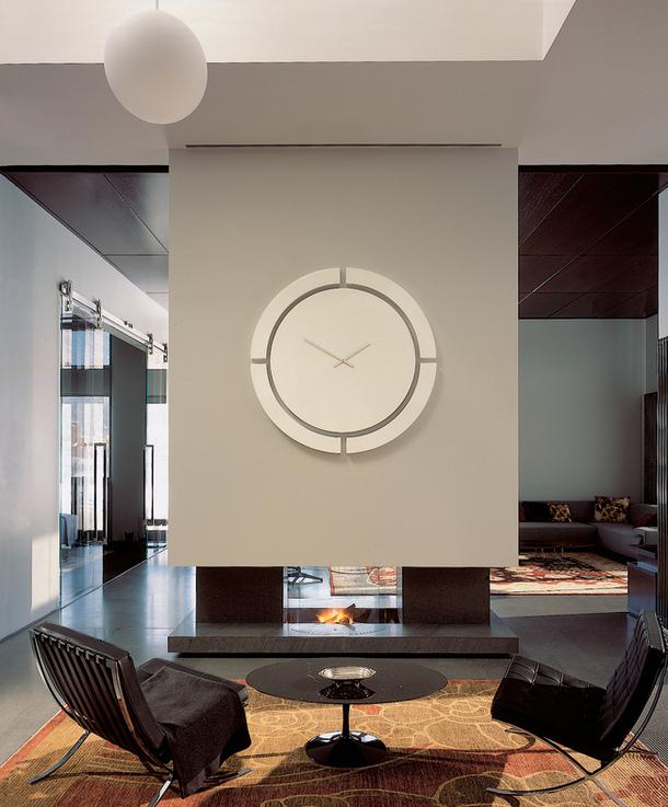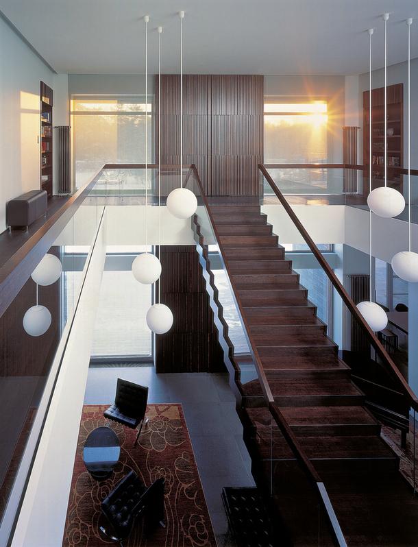 Внутри дома есть галерея с двусветным атриумом. Тут же расположена и лестница, причем ее пролет как бы упирается в стеновую панель из дуба. Но это не панель, а двери лифта.