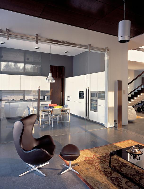 Кухня тоже отделена от столовой комнаты стеклянной перегородкой, которую освещают Torgetti.