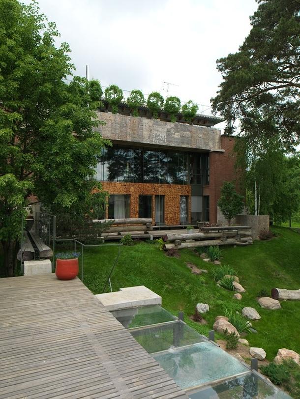 Елена и Станислав Пошвыкины, московские архитекторы, называют свой дом “Плотиной”, но стоит он не на воде. Солословский пейзаж - это череда холмов, так что пришлось почти целый этаж утопить в земле, причем так, чтобы не повредить рядом растущие деревья.
