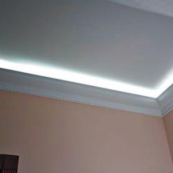 После того, как готовый плинтус просохнет, зачистите его мелкой шкуркой. Затем плинтус грунтуется и красится, а как только краска хорошо просохнет, можно приступать к монтажу скрытой подсветки. В потолочный плинтус с подсветкой принято устанавливать диодные трубки или длинные галогенные лампы, которые соединяют между собой.