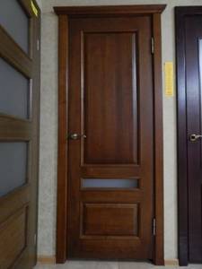 - древесина (самый экологичный, износостойкий и надежный материал. В большинстве случаев используются куски дерева, в более дорогих моделях – цельное дерево. Обязательно такие двери оснащены надежной фурнитурой, поскольку обладают большим весом);