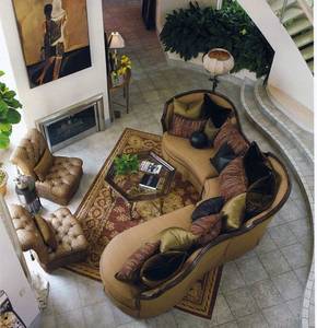 Нет стандарта на выбор цветовой гаммы в оформлении гостиной в таком стиле: можно использовать как теплые светлые тона, так и яркие сочные. Но существует обязательное условие: грамотное сочетание всех цветов с преобладающими светлыми оттенками. На пол можно уложить ламинат, паркет, стены же окрашиваются подходящим цветом, который вполне можно комбинировать с обоями. Как уже говорилось выше, гостиную чаще всего объединяют с кухней. Такую мебель, как большой диван, кресло, тумбочку, журнальный столик располагают в центре комнаты. Предпочтение отдается деревянной мебели. По желанию вдоль стен устанавливается деревянный комод, полки с комнатными цветами и различные стилизованные аксессуары. Для большого комфорта и уютной атмосферы делается камин. Чтобы большая гостиная была светлой, устанавливаются для этого большие окна, оборудуется искусственное освещение в виде точечной подсветки потолка, люстр, настенных бра. Вместо оконных штор отлично подойдут жалюзи. Стены украшают чаще всего фотографиями, одну из стен можно оформить в качестве доски почета: повесить на нее дипломы, различные награды, значимые фото.