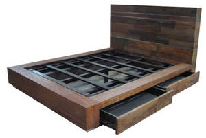 Особенно фактурно смотрятся доски необычной формы и стволы деревьев, искореженные, спиленные особым срезом, которые пошли на изготовление стоек или боковин. В остальном же ложе мало чем отличается от стандартного чертежа обычной кровати.