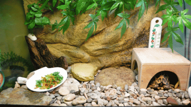 Террариумы для сухопутных черепах обычно довольно просты: невысокий ящик с отверствиями для воздуха, но его может заменить и стеклянный вариант.