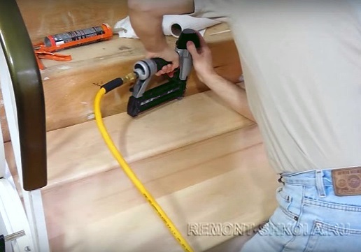 Производим крепление верхней накладки с помощью пневмопистолета. Крепление производится в месте её прилегания к боковой части ступени. Эта часть перекроется торцом боковой накладки и в результате места крепления будут незаметны.