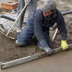 Следующую линию с шурупами следует располагать уже на расстоянии 1-1,5 м от предыдущей (расстояние должно быть несколько меньшим, чем длина правила, которым будет разравниваться слой бетона или цементного раствора). Накладывается раствор на шурупы и поверх него устанавливается маячковая рейка. Выставив окончательно все рейки в одну плоскость по уровню, необходимо дождаться пока раствор, на котором они лежат полностью схватился и высох.
