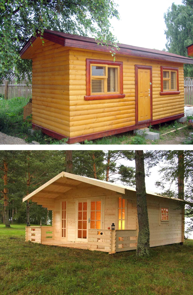 Бревенчатые и брусовые бытовки роскошно выглядят, см. рис. справа, но по стоимости и трудоемкости не уступают дому большего размера, и строятся по той же технологии. Строят их редко, в основном, если в дальнейшем предполагается переоборудование бытовки в баню; каркасные строения для этого не подходят. В таком случае бытовку сразу строят на месте бани и обустраивают стоком по всем правилам, а печь, душ, банное оборудование закупают и полати ставят, когда дом уже готов.