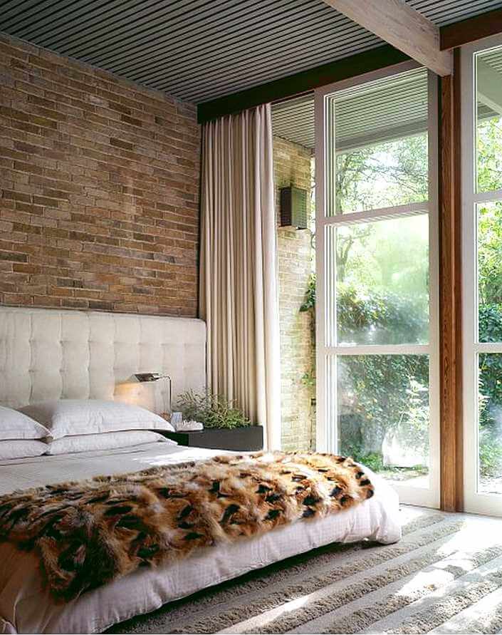 Большинство людей скажут вам, и они конечно будут правы, что самое главное в спальне это уют. Но, к счастью использование кирпича в дизайне, совсем не исключает этого. Все элементы дизайна спальной комнаты могут быть связаны воедино именно кирпичом.