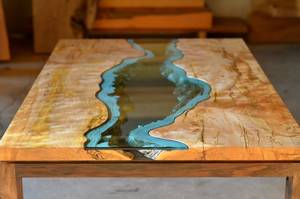 - Покрытая эпоксидной смолой основа. Этот вариант предполагает заливку прозрачным составом подготовленной из древесного или другого материала поверхности стола. Таким образом, можно преобразить любой старый стол.К эпоксидному составу часто добавляют красители. Отвердевшая смола выступает как в качестве влагозащитного пласта, так и в виде декоративного покрытия.