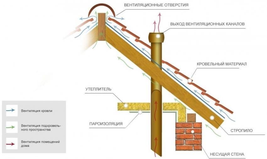 Проще всего сделать это, оборудовав отверстие в пленке, защищающей чердак от ветра. Оптимальное местоположение – возле конькового прогона. Кроме того, если для ветровой подшивки используется дерево, укладывать его рекомендуется с небольшим зазором – 2-3 миллиметра. Если используется пластиковый материал, в нем следует проделать небольшие отверстия.