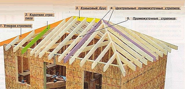 - Короткие стропила фиксируются не на коньковом брусе, а на угловом стропиле.