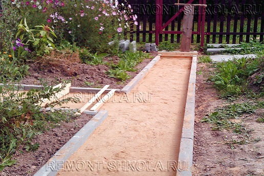 После устройства несущего слоя фундамента дачной дорожки расстояние от него до верха бордюрного камня (плоскости дорожки) должно составить около 10 см (3 см — выравнивающий слой из песка и 7 см — брусчатка). Сначала нужно уложить выравнивающий слой из песка.