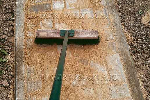 После окончания укладки всей плитки протрамбуйте всю уложенную плитку с помощью ручной трамбовки. Просыпьте всю поверхность сухим просеянным речным песком и с помощью щётки разметите его по всей поверхности, втирая песок в межплиточные швы.
