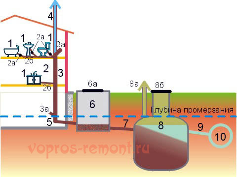 Устройство канализации более чем на 1 куб. м стоков в сутки включает в себя внутреннюю и внешнюю части, делящиеся на следующие узлы, см. рис.: