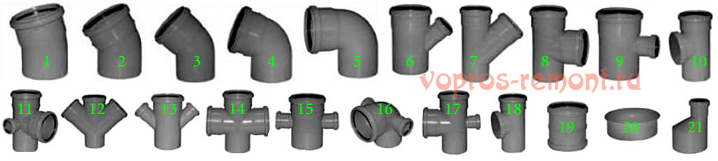 Фитинги для канализации выпускаются в широчайшем ассортименте; на рис. – далеко не полное собрание. Порой и опытный мастер в недоумении скребет там, где шапку носят: к чему бы оно, хрень-то этакая? Кстати, сборные узлы, т.е. вставки с ревизионными люками, лучше выбирать классического типа, с крышками на болтах и резиновыми прокладками. Из футуристических конструкций со сдвижными шторками рано или поздно вонью понесет.