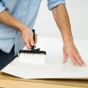 • Шаг № 3. Наносим на него кистью или валиком клей. Особое внимание – краям. Лучше промазать клеем и стену.