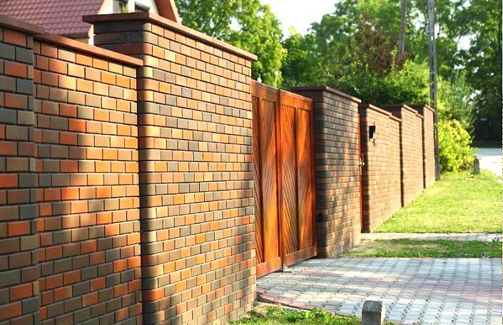Кирпич — распространённое решение для заборов. Если по дешевле — облицовочный кирпич, подороже — клинкерный. При решении о применении кирпича есть возможность адекватного выбора не только производителя, но цвета и текстуры. И сегодня имеется реальная возможность сделать красивый кирпичный забор. Кроме традиционного красного у кирпича бывает практически любой цвет. Делая расшивку забора из кирпича применяйте сочетающуюся с основным цветом затирку для швов.