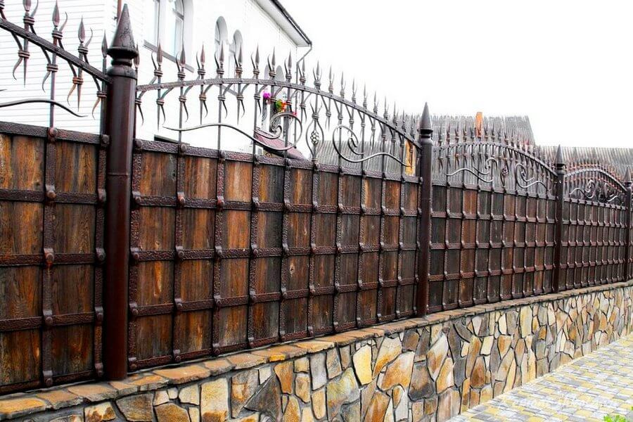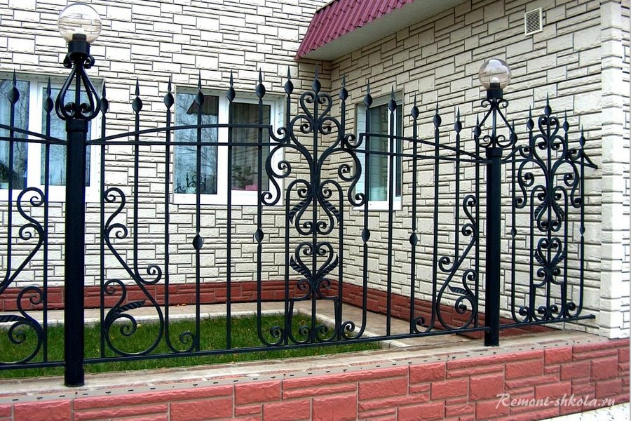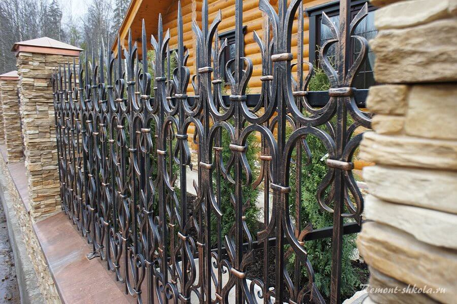 Конструкции из металла легко подбираются для домов, построенных в разных стилях. Существует различные виды таких конструкций: ковка, из сетки, из профлиста профнастила, чугунный, алюминиевый. Их ценовая категория варьируется очень широко. Ведь и кованный, и забор из простой оцинкованной сетки сделаны из металла. Рассмотрим наиболее распространенные варианты. Но начнём не с самого распространённого, но несомненно, самого притягательного и выдающегося представителя металлической линейки.