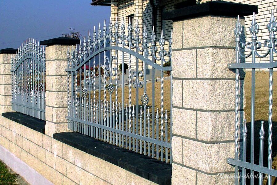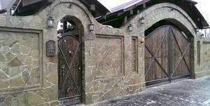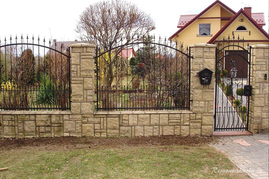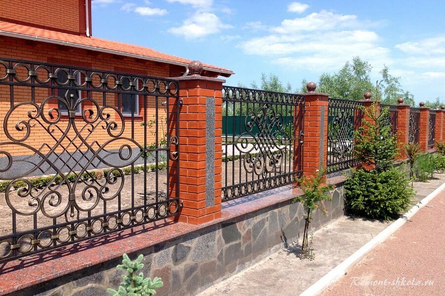 Заборы и ограждения для дома:  фото варианта комбинированного типа — столбы из рваного вибропрессованного кирпича, пролеты на 1/3 из кирпича того же вида и металлические экраны с элементами ковки. Ворота и калитка выполнены в одном стиле со вставками