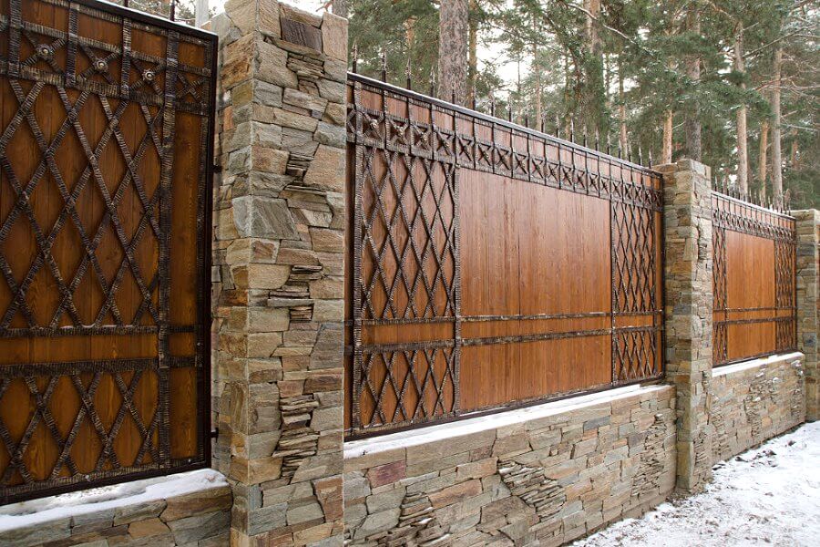 Дизайнеры не рекомендуют строить  ограждения из камня для маленьких участков. Использовать камень на не больших площадях можно для сооружения столбов в комбинации с металлическими или деревянными пролётами. Часто, из за высокой цены на качественный камень, на внутренней стороне забора используется более дешевый материал. Это бывает цементный раствор или дерево.