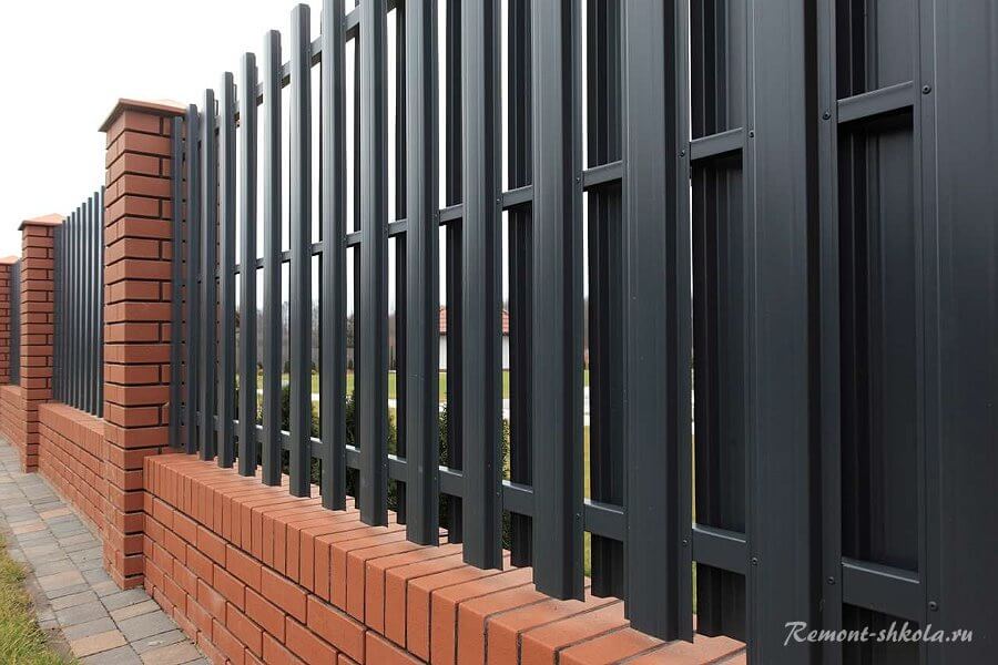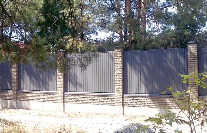 Самое распространённое сочетание профнастила и кирпичных столбов в одном изделии давно завоевало пальму первенства