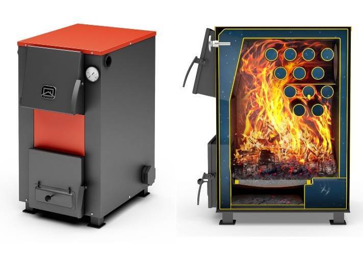 Цилиндрическая форма обеспечивает беспрепятственную циркуляцию теплоносителя, а, соответствующий размерам топки, увеличенный в размерах ящик зольника позволяет реже проводить обслуживание.