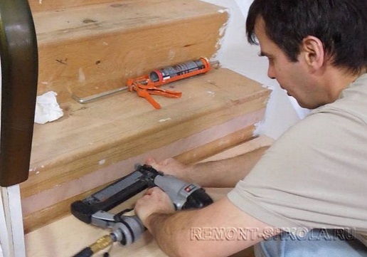Производим крепление верхней накладки с помощью пневмопистолета. Крепление производится в месте её прилегания к боковой части ступени. Эта часть перекроется торцом боковой накладки и в результате места крепления будут незаметны.
