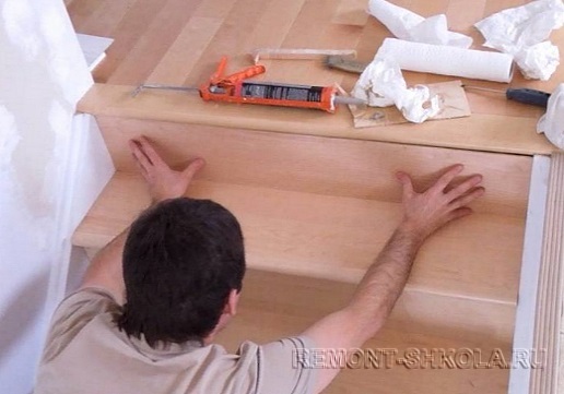 Пришло время установки верхней накладки на деревянные ступени для лестницы. Поступаем следующим образом: наносим монтажный клей на верхнюю часть ступени,