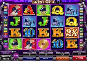 После того как пользователь принимает решение играть онлайн в автоматы игровые, в первую очередь ему следует начать с изучения возможностей специальных символов. Помимо уже представленного «разброса», который умеет складываться в комбинации независимо от места выпадения, в игре The Rat Pack присутствует два «диких» символа. На первом из них изображена надпись 2X. Данная карточка способна дополнять собой любые комбинации, кроме тех, которые складываются из символов «разброса». При этом коэффициенты таких комбинаций увеличиваются вдвое.