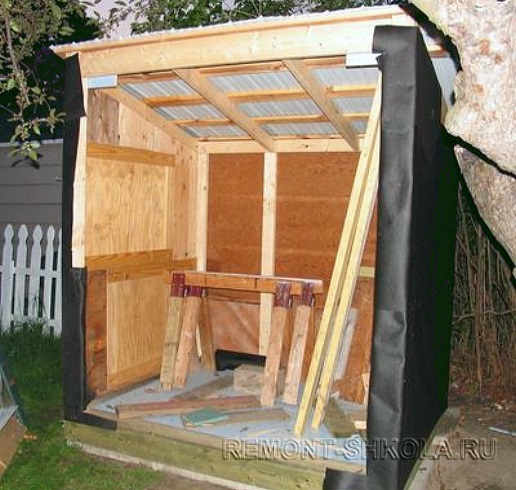 После монтажа фанеры на боковых плоскостях сарая, она была покрыта толем, так же оставшимся от предыдущего объекта. Использование толя совсем не является обязательным этапом в сооружении сарая, но точно не вредным.