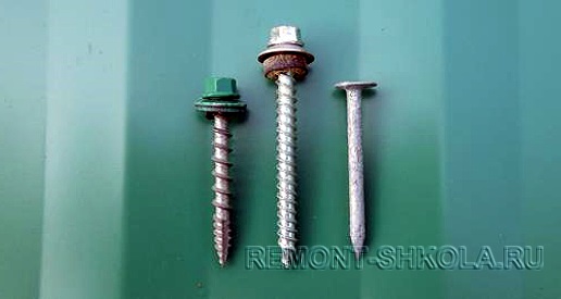 Крепится профлист с помощью специальных кровельных саморезов с резиновой прокладкой (уплотнительной шайбой), исключающей проникновение воды, через отверстие крепления.