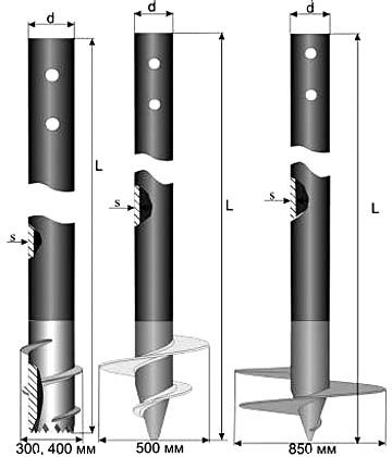 Справа – свая с уширенной пятой для рыхлых, пучинистых и плывущих грунтов. s = (4-16 мм); L = (3-15) м с шагом в 3 м; d = 159, 219, 325 мм. Несомая нагрузка – (1-3,5) т. Стоимость одной – от 3500 руб. Хотя ее наконечник с винтом может быть не литым или кованым, а сварным из листового металла, сделать такую самостоятельно сложно, т.к. лопасть ее винта должна иметь не менее 2-х оборотов и, сужаясь, доходить почти до острия наконечника.