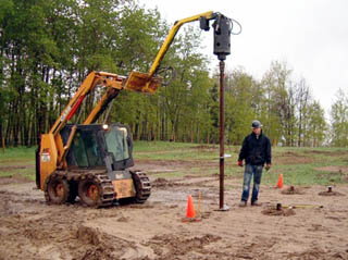 Механическим способом сваи в индивидуальном строительстве заворачивают чаще всего мини-экскаватором со сваезаворачивателем, см. рис. Аренда или наем вместе с оператором такой машины стоят в несколько раз дешевле, чем «большой» спецтехники, а в обычные российские грунты он вгоняет сваю длиной до 12 м и диаметром до 159 мм. На заворачивание одной уходит 3-10 мин., смотря по грунту; вертикальность получается автоматически. Бортовая электроника некоторых моделей «мини-эков» может сопрягаться с лазерным нивелиром, так что и верхушки свай выйдут сразу в одну плоскость. В общем, оптимальный вариант.