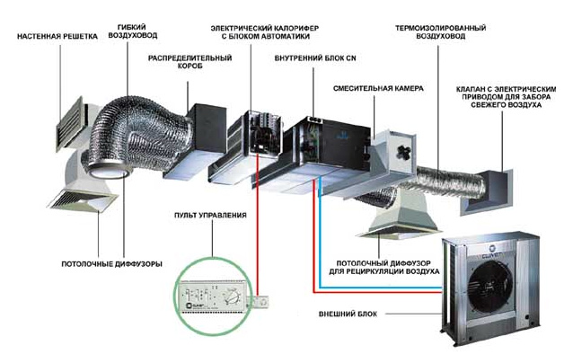 В особняках и пентхаузах обеспеченных домовладельцев удобна, незаметна и экономична принудительная вентиляция с кондиционированием воздуха (сплит-система). Это, в порядке следования секций-коробов: общий воздухозаборник, фильтр, нагнетатель, охладитель/калорифер двухстороннего кондиционера, увлажнитель/осушитель, магистральный короб, распределительные патрубки, потолочные отдушины с вьюшками в комнатах.
