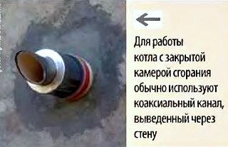 Закрытая камера сгорания котла полностью изолирована от помещения. Подача воздуха для горения в камеру производится снаружи дома по специальной трубе с помощью электрического вентилятора. Продукты сгорания отводятся в дымоход принудительно под действием избыточного давления, создаваемого вентилятором в камере сгорания.