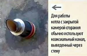 Для котлов с закрытой топкой часто применяют коаксиальные (труба в трубе) дымоходы. В таком устройстве по центральной внутренней трубе из котла выходят продукты сгорания, а наружная труба служит для забора и подачи наружного воздуха к горелке котла.