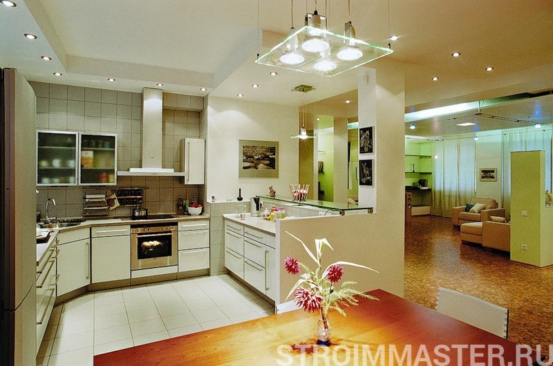 Но нас интересует именно способности света разделить пространство. Достичь этого можно несколькими путями: сделать освещение разных цветов. В этом случае, даже «физические» ограничители могут не пригодиться – разница будет более чем ощутима, но смотреться такой вариант может аляповато. Допустимо создать область затенения между кухней и столовой, но будьте осторожны – обидно будет подскользнуться в этих искусственных сумерках. И еще один способ – напротив, стена яркого света. Но и с ней нужно обращаться аккуратнее: в светлых интерьерах этот свет рассеется, а проходящему через него придется привыкать к такой «вспышке».