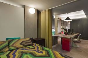 - Можно быстро убрать или заменить перегородку из штор, как на фото. Это очень удобно в тех случаях, когда необходимо обновить интерьер.