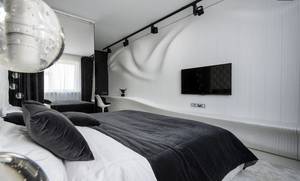 Белый цвет стены изменять нельзя, иначе не получится эффект расширения пространства и его закручивание возле определенного элемента декора. Им должна стать кровать, причем не просто ложе, которое накрытое пледом, а конструкция, покрытая постельным бельем в стиле 3D. Каким? Сказать трудно, так как у каждых хозяев свое предпочтение, но вы можете воспользоваться полным каталогом подобного продукта с сайта http://postel-nadom.com.ua/catalog/postelnoe-bele-3d/. Оно станет необычным пятном в ультрасовременном интерьере, напоминающем жилые каюты космической станции.