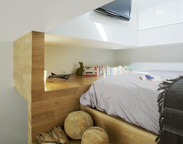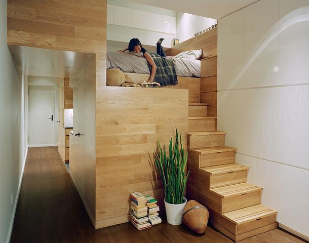 Маленькое пространство всегда можно организовать различными способами, в том числе стены снести и этаж под крышей добавить. Некоторые жильцы устраивают спальни прямо на антресолях или строят дом в доме, как русская матрешка. Но американцы пошли иным путем: они расширили пространство не только с помощью цвета и света, но и добавили кубов из натурального дерева и лестниц из того же материала.