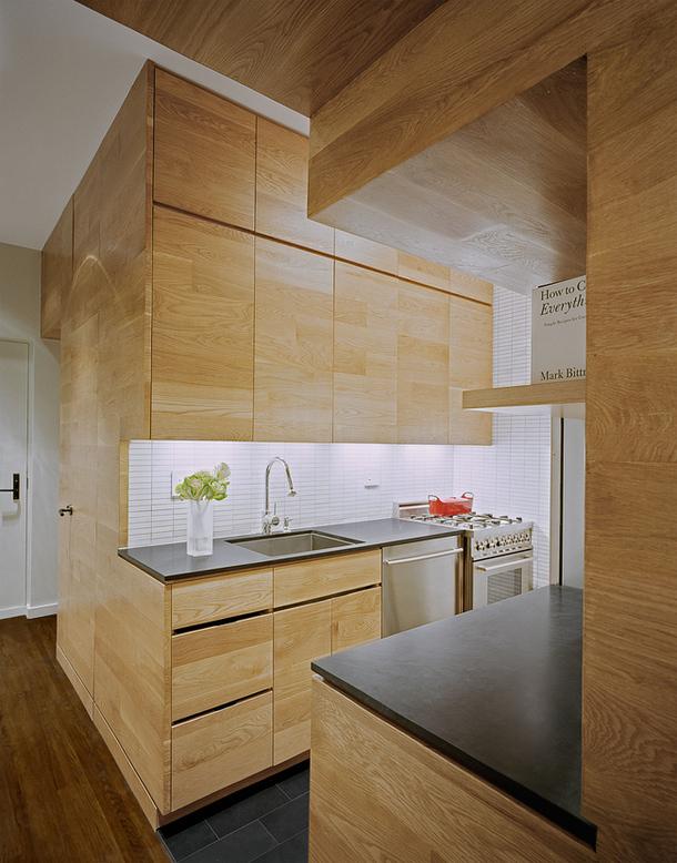 Сконструировать из панелей (дубовых) личную зону, в которую включили не только кухню, но и ванную комнату, гардеробную комнату и спальню.