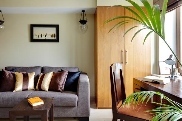 Здесь много предметов из антикварного тика. У них строгая грубоватая форма, однако, несмотря на экзотический материал, выглядят они современно. Хозяйка этой квартиры любит простоту, поэтому и решенобыло сделать необычный интерьер с элементами экостиля и этнических аксессуаров.